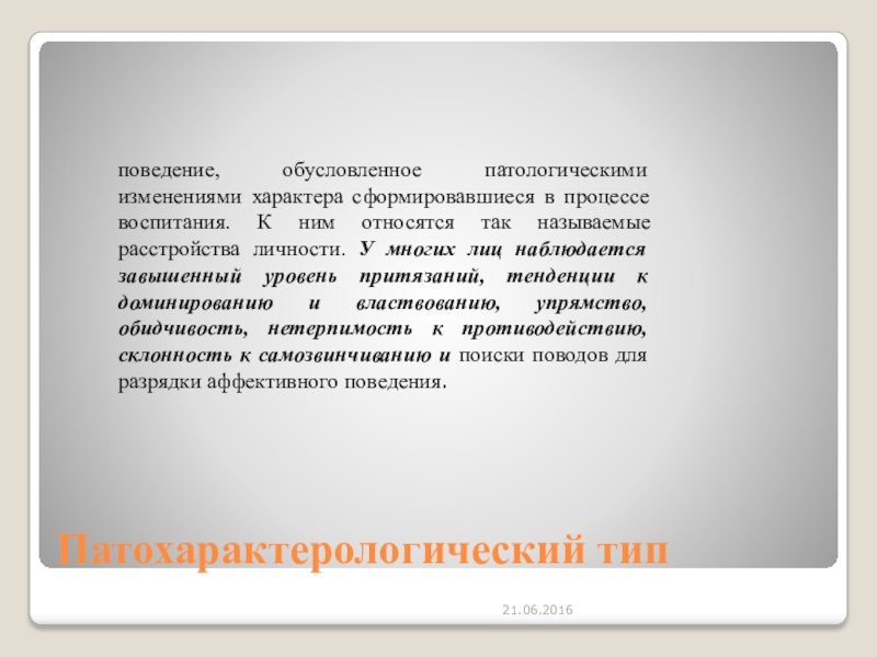 ним относятся так называемые расстройства личности. У многих лиц наблюдается завышенный уровень притязаний, тенденции к доминированию и властвованию, упрямство, обидчивость, нетерпимость к противодействию, склонность к самозвинчиванию и поиски поводов для разрядки аффективного поведения.