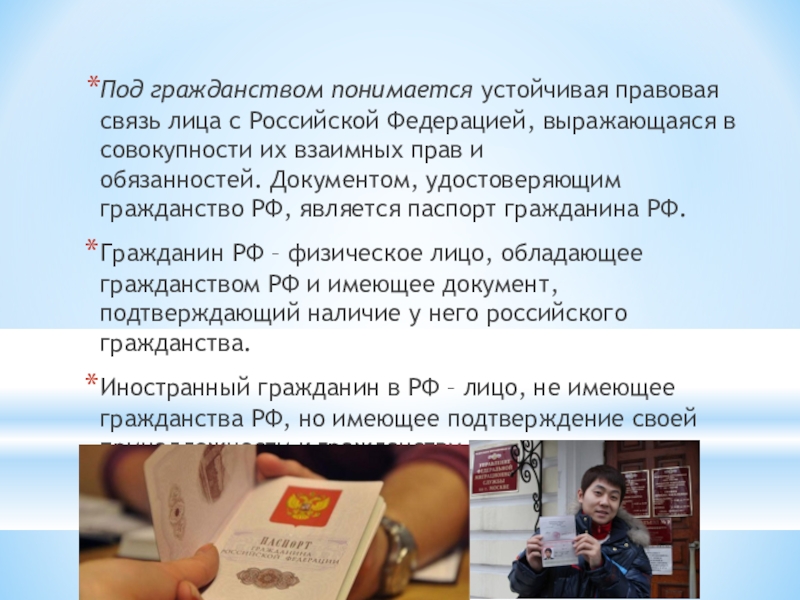 Под гражданством понимается устойчивая правовая связь лица с Российской Федерацией, выражающаяся в совокупности их взаимных прав и обязанностей. Документом, удостоверяющим