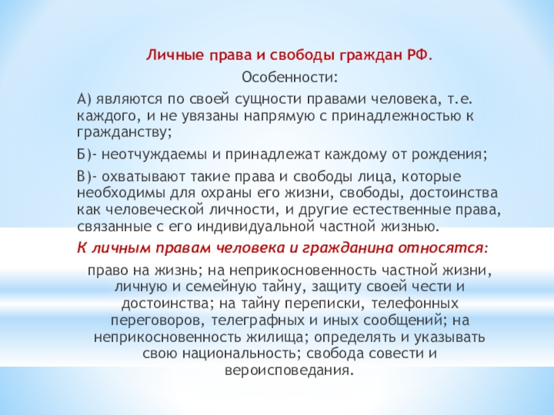 Личные права и свободы граждан РФ.Особенности:А) являются по своей сущности правами человека, т.е. каждого, и не увязаны