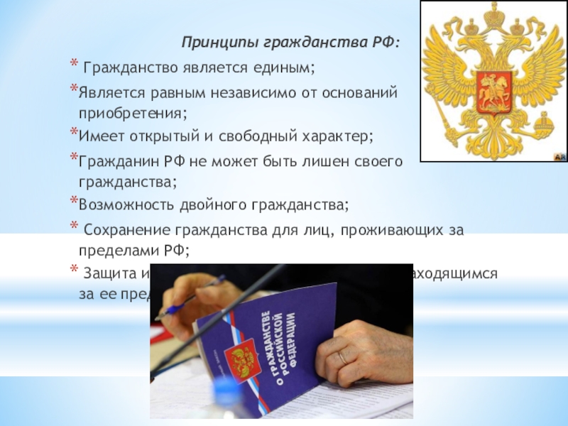 Принципы гражданства РФ: Гражданство является единым; Является равным независимо от оснований приобретения; Имеет открытый и свободный характер; Гражданин