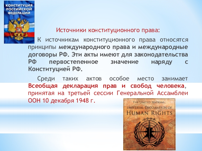 Источники конституционного права:	К источникам конституционного права относятся принципы международного права и международные договоры РФ. Эти акты имеют