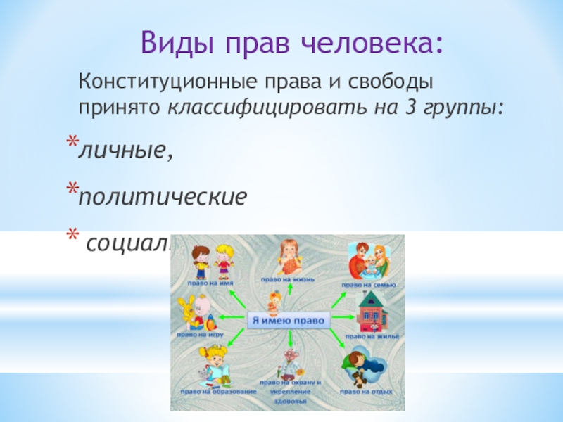 Виды прав человека:Конституционные права и свободы принято классифицировать на 3 группы:личные, политические социально-экономические