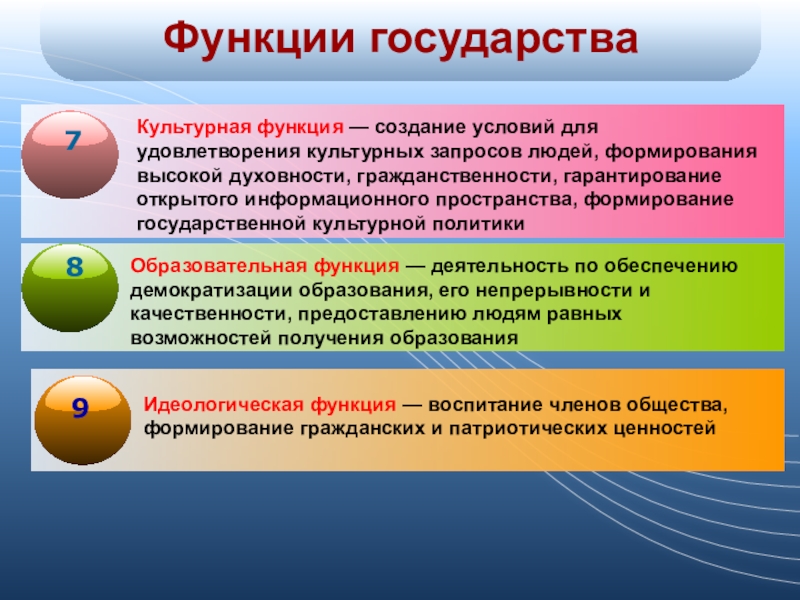 Идеологическая функция — воспитание членов общества, формирование гражданских и патриотических ценностей