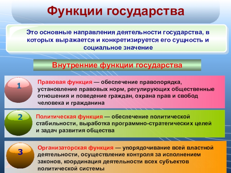 Организаторская функция — упорядочивание всей властной деятельности, осуществление контроля за исполнением законов, координация деятельности всех субъектов политической системы