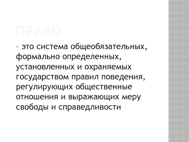 право – это система общеобязательных, формально определенных, установленных и охраняемых государством правил поведения, регулирующих общественные отношения и