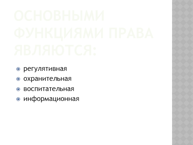 Основными функциями права являются:регулятивнаяохранительнаявоспитательнаяинформационная