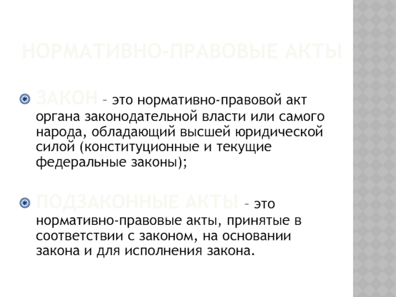 НОРМАТИВНО-ПРАВОВЫЕ АКТЫзакон – это нормативно-правовой акт органа законодательной власти или самого народа, обладающий высшей юридической силой (конституционные