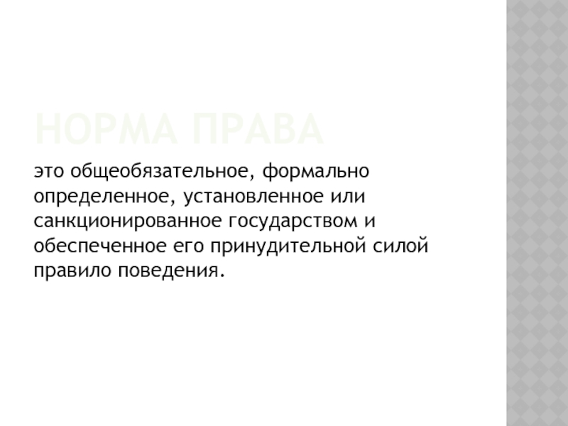Норма права это общеобязательное, формально определенное, установленное или санкционированное государством и обеспеченное его принудительной силой правило поведения.