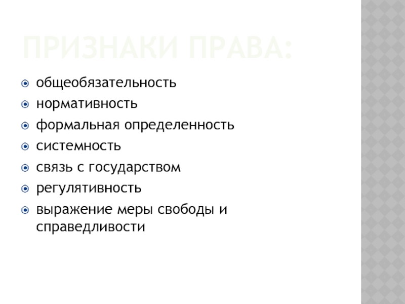 Признаки права:общеобязательностьнормативностьформальная определенностьсистемностьсвязь с государствомрегулятивностьвыражение меры свободы и справедливости