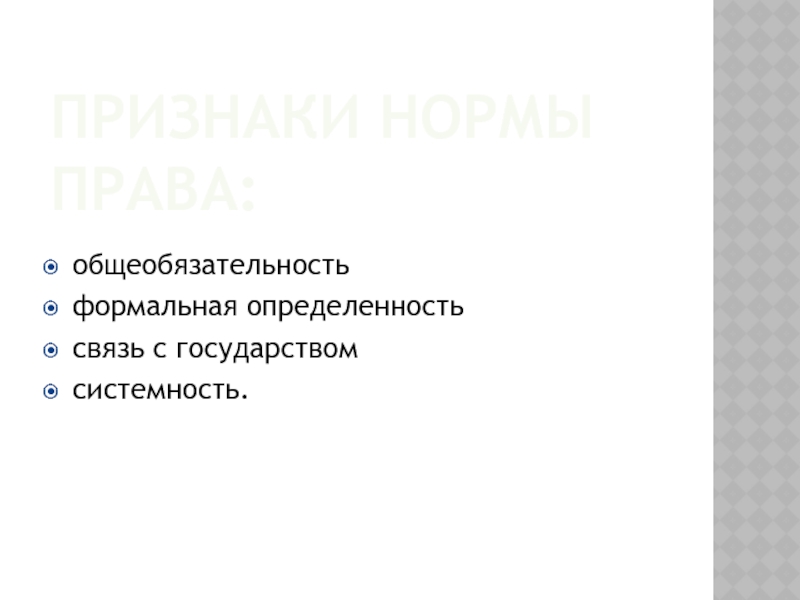 Признаки нормы права:общеобязательностьформальная определенностьсвязь с государствомсистемность.