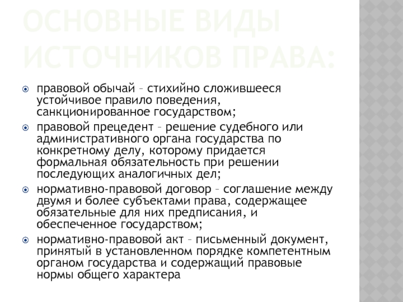 Основные виды Источников права:правовой обычай – стихийно сложившееся устойчивое правило поведения, санкционированное государством;правовой прецедент – решение судебного