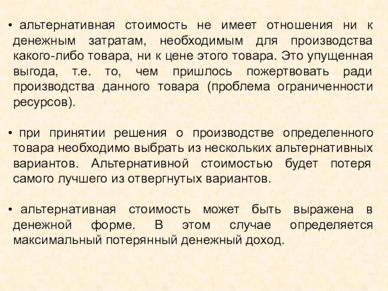 при принятии решения о производстве определенного товара необходимо выбрать из нескольких альтернативных вариантов. Альтернативной стоимостью будет потеря самого лучшего из отвергнутых вариантов.