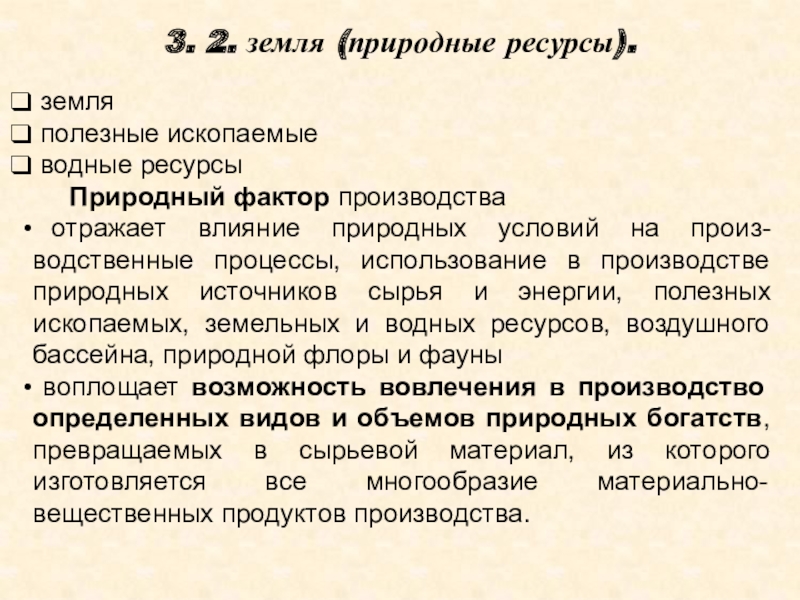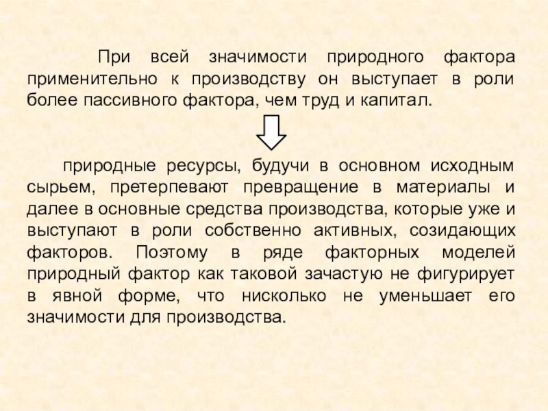 природные ресурсы, будучи в основном исходным сырьем, претерпевают превращение в материалы и далее в основные средства производства, которые уже и выступают в роли собственно активных, созидающих факторов. Поэтому в ряде факторных моделей природный фактор как таковой зачастую не фигурирует в явной форме, что нисколько не уменьшает его значимости для производства.