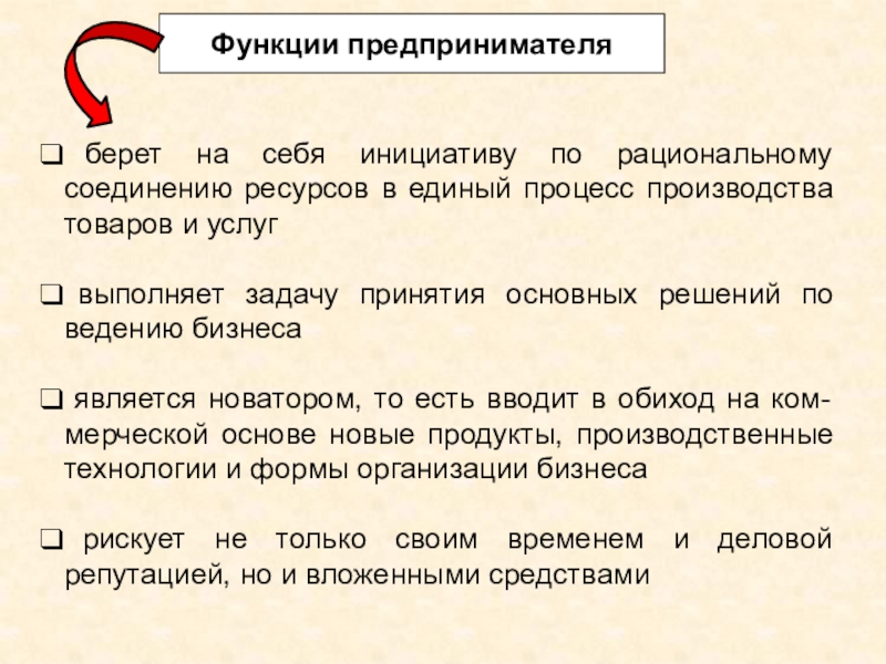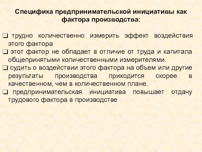 Слайд 30Специфика предпринимательской инициативы как фактора производства: