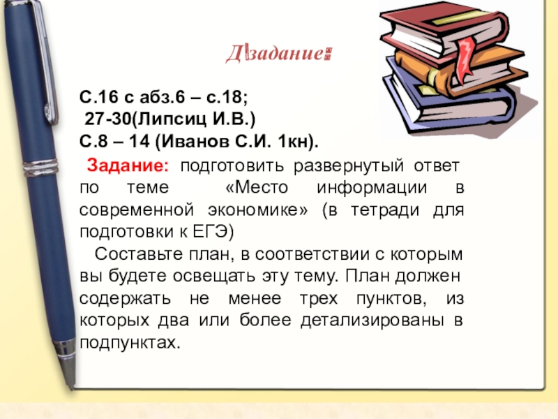 Задание: подготовить развернутый ответ по теме «Место информации в современной экономике» (в тетради для подготовки к ЕГЭ)
