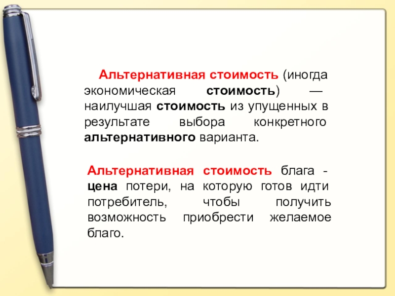 Слайд 5 Альтернативная стоимость (иногда экономическая стоимость) — наилучшая стоимость из
