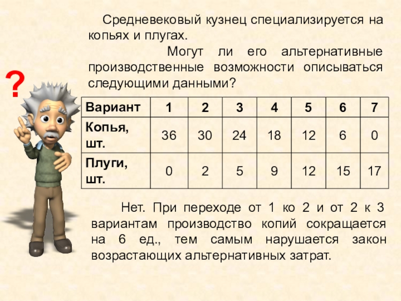 Нет. При переходе от 1 ко 2 и от 2 к 3 вариантам производство копий сокращается на 6 ед., тем самым нарушается закон возрастающих альтернативных затрат.