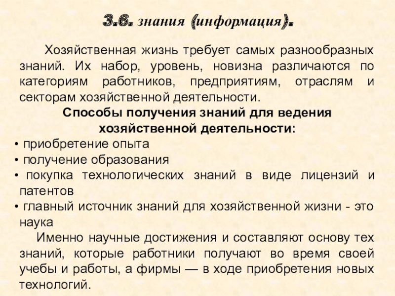 Именно научные достижения и составляют основу тех знаний, которые работники получают во время своей учебы и работы, а фирмы — в ходе приобретения новых технологий.