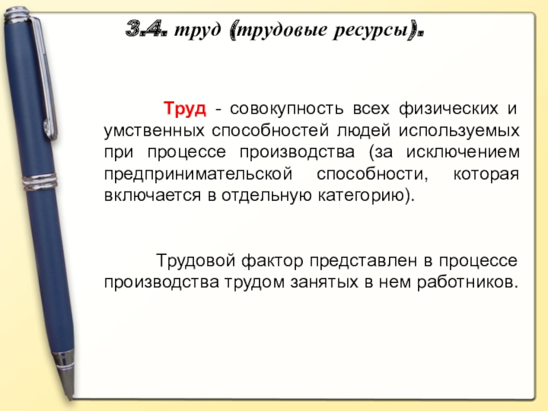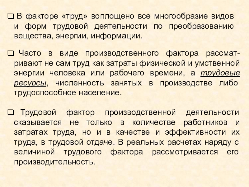 Часто в виде производственного фактора рассмат-ривают не сам труд как затраты физической и умственной энергии человека или рабочего времени, а трудовые ресурсы, численность занятых в производстве либо трудоспособное население.