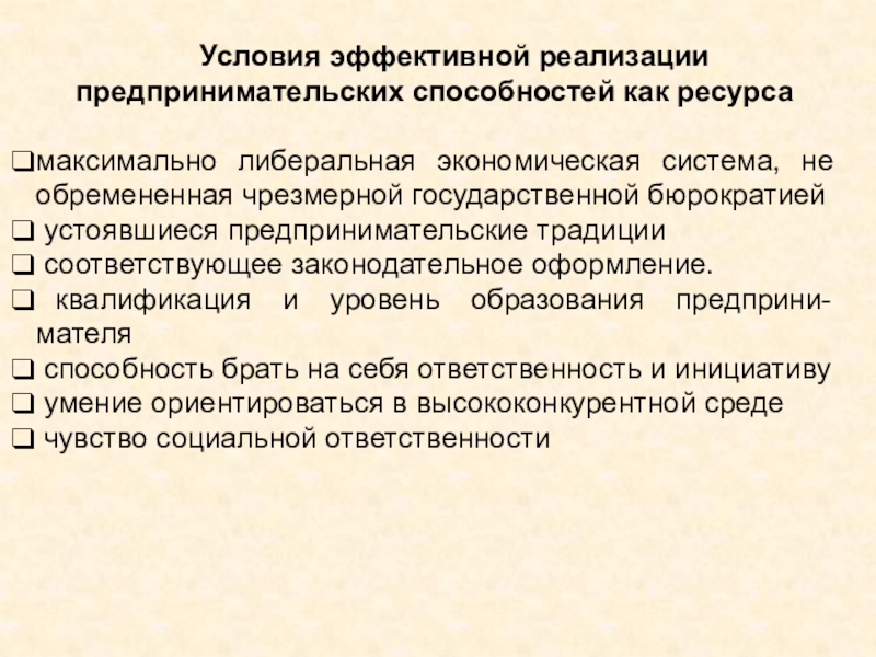 Слайд 31 Условия эффективной реализации предпринимательских способностей как ресурса