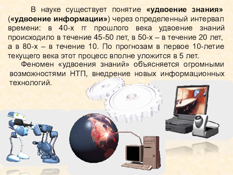 Феномен «удвоения знаний» объясняется огромными возможностями НТП, внедрение новых информационных технологий.