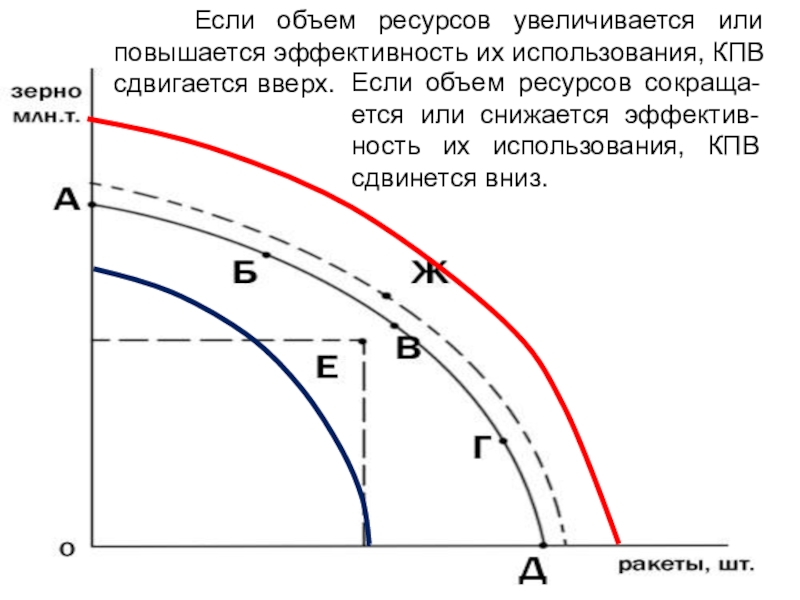 Если объем ресурсов сокраща-ется или снижается эффектив-ность их использования, КПВ сдвинется вниз.