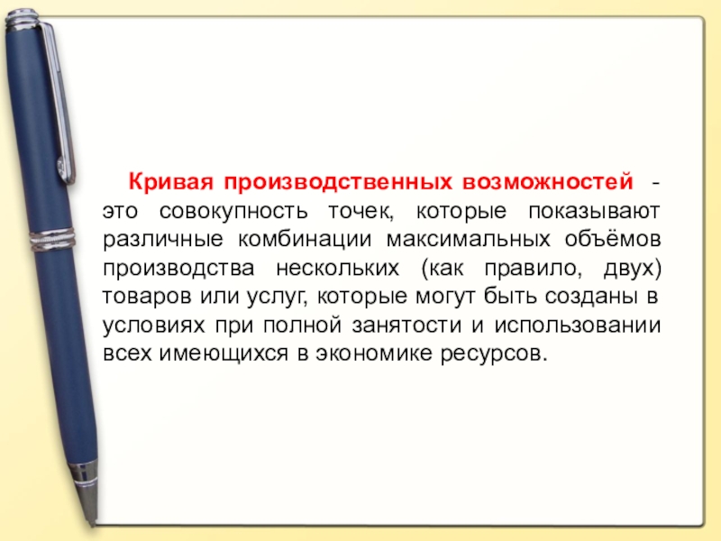 Слайд 9 Кривая производственных возможностей -это совокупность точек, которые показывают различные