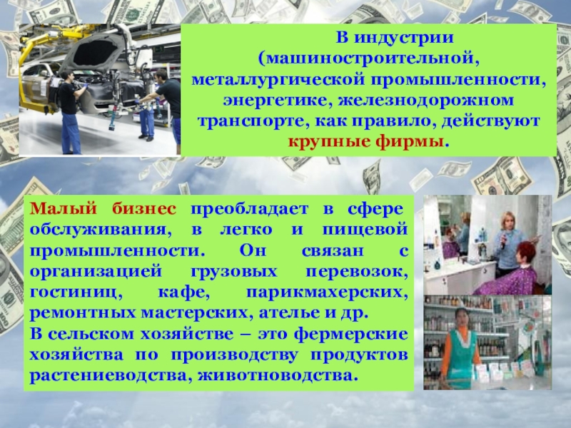 Малый бизнес преобладает в сфере обслуживания, в легко и пищевой промышленности. Он связан с организацией грузовых перевозок, гостиниц, кафе, парикмахерских, ремонтных мастерских, ателье и др.