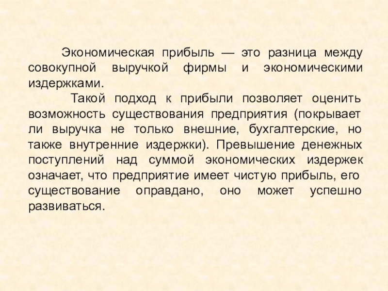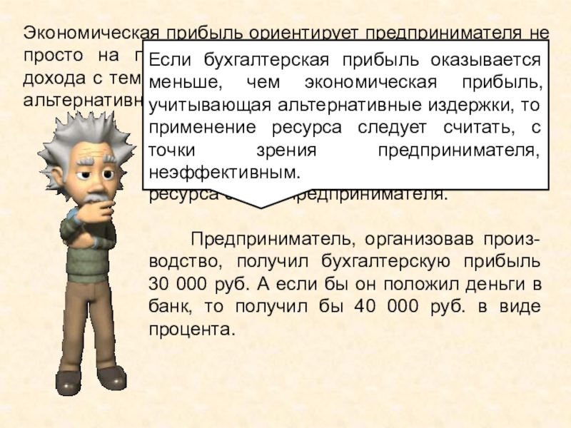 Экономическая прибыль ориентирует предпринимателя не просто на получение дохода, но на сравнение этого дохода с тем, который мог бы быть получен в результате альтернативного применения имеющихся ресурсов.