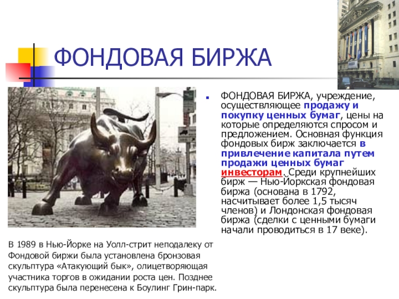 на которые определяются спросом и предложением. Основная функция фондовых бирж заключается в привлечение капитала путем продажи ценных бумаг инвесторам. Среди крупнейших бирж — Нью-Йоркская фондовая биржа (основана в 1792, насчитывает более 1,5 тысяч членов) и Лондонская фондовая биржа (сделки с ценными бумаги начали проводиться в 17 веке).