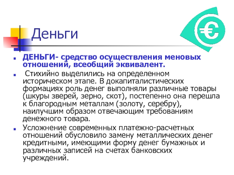 ДЕНЬГИ- средство осуществления меновых отношений, всеобщий эквивалент.