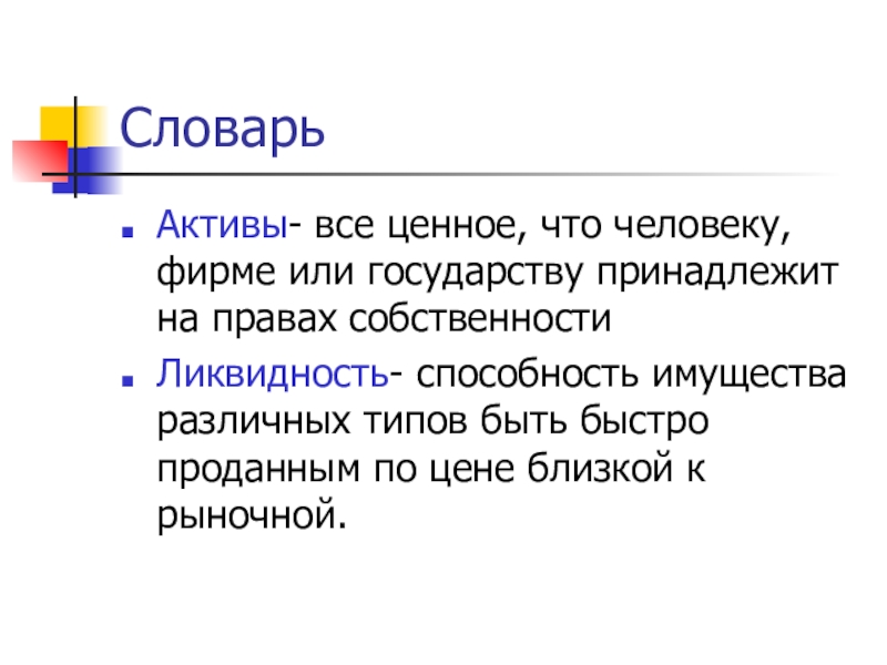 Активы- все ценное, что человеку, фирме или государству принадлежит на правах