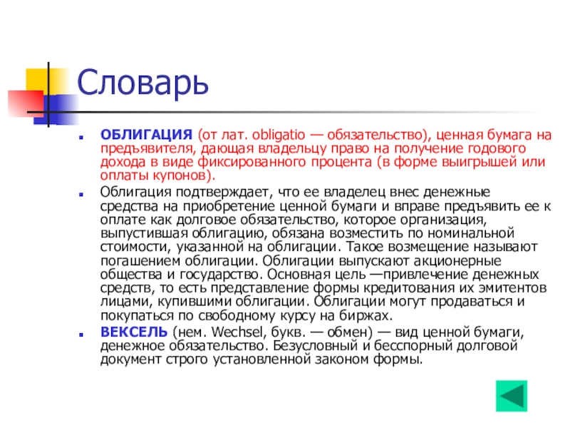 Облигация подтверждает, что ее владелец внес денежные средства на приобретение ценной бумаги и вправе предъявить ее к оплате как долговое обязательство, которое организация, выпустившая облигацию, обязана возместить по номинальной стоимости, указанной на облигации. Такое возмещение называют погашением облигации. Облигации выпускают акционерные общества и государство. Основная цель —привлечение денежных средств, то есть представление формы кредитования их эмитентов лицами, купившими облигации. Облигации могут продаваться и покупаться по свободному курсу на биржах.