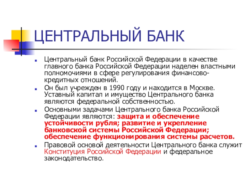 Основными задачами Центрального банка Российской Федерации являются: защита и обеспечение устойчивости рубля; развитие и укрепление банковской системы Российской Федерации; обеспечение функционирования системы расчетов.