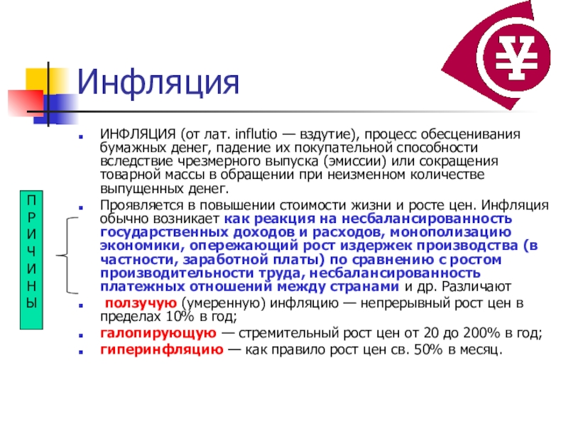 Проявляется в повышении стоимости жизни и росте цен. Инфляция обычно возникает как реакция на несбалансированность государственных доходов и расходов, монополизацию экономики, опережающий рост издержек производства (в частности, заработной платы) по сравнению с ростом производительности труда, несбалансированность платежных отношений между странами и др. Различают