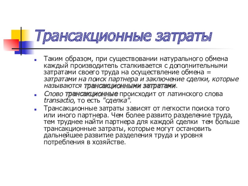 дополнительными затратами своего труда на осуществление обмена = затратами на поиск партнера и заключение сделки, которые называются трансакционными затратами.