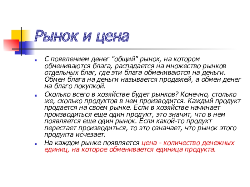 На каждом рынке появляется цена - количество денежных единиц, на которое обменивается единица продукта.