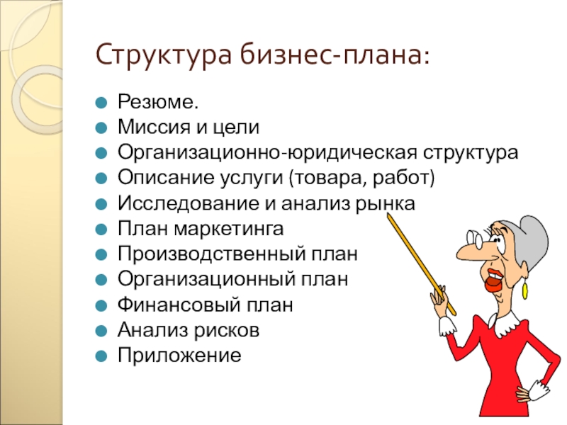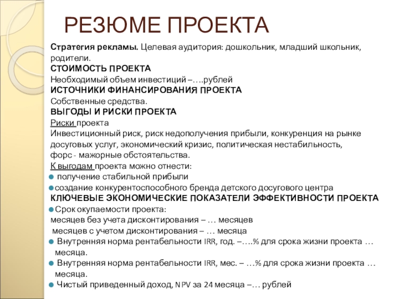 Резюме – краткое изложение основных положений предполагаемого плана,