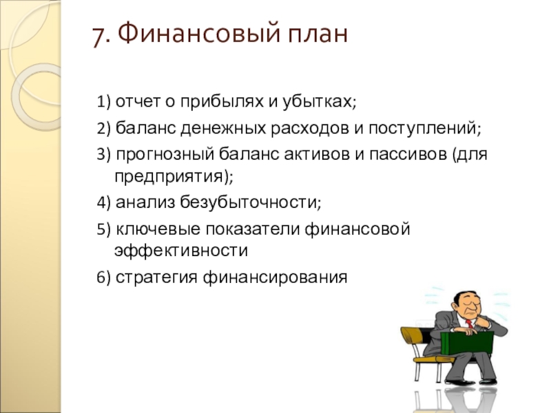 6. Бизнес-план - документ, на основе которого осуществляется планирование предпринимательской деятельности. В зависимости от цели разработки бизнес-плана его структура, состав, количество и содержание разделов могут быть различными. Бизнес-план разрабатывается для обоснования нового проекта, организации нового бизнеса, для привлечения инвестора, обоснования целесообразности и выгодности вложения средств в развитие данного бизнеса; для восстановления платежеспособности и финансового оздоровления предприятия; для планирования деятельности функционирующего предприятия и др.