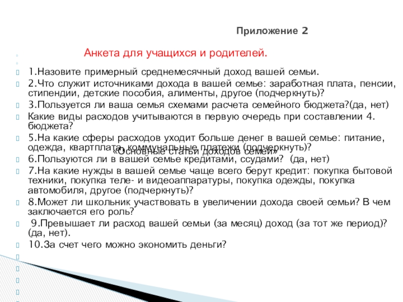 2.Что служит источниками дохода в вашей семье: заработная плата, пенсии, стипендии, детские пособия, алименты, другое (подчеркнуть)?