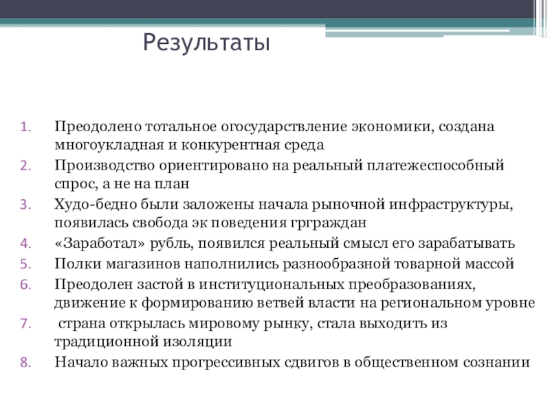 Худо-бедно были заложены начала рыночной инфраструктуры, появилась свобода эк поведения грграждан