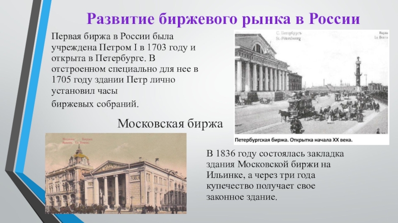 Первая биржа в России была учреждена Петром I в 1703 году и открыта в Петербурге. В отстроенном специально для нее в 1705 году здании Петр лично установил часы