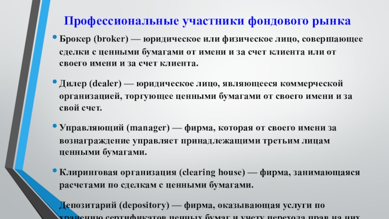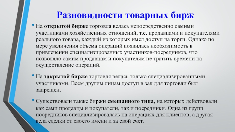 отношений, т.е. продавцами и покупателями реального товара, каждый из которых имел доступ на торги. Однако по мере увеличения объема операций появилась необходимость в привлечении специализированных участников-посредников, что позволяло самим продавцам и покупателям не тратить времени на осуществление операций.