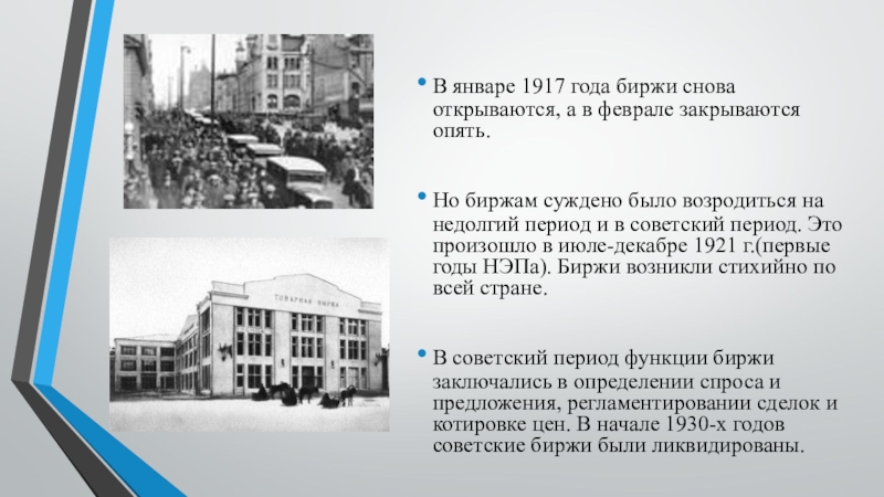 Но биржам суждено было возродиться на недолгий период и в советский период. Это произошло в июле-декабре 1921 г.(первые годы НЭПа). Биржи возникли стихийно по всей стране.