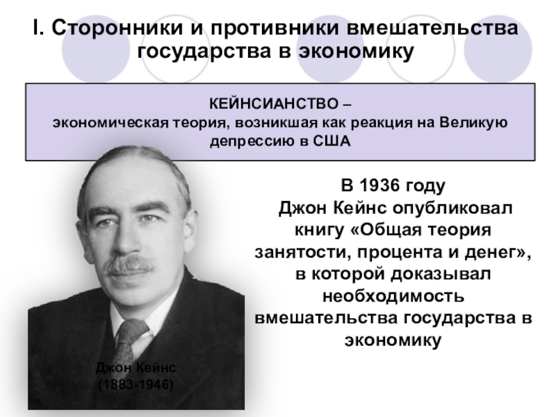 Джон Кейнс опубликовал книгу «Общая теория занятости, процента и денег», в которой доказывал необходимость вмешательства государства в экономику