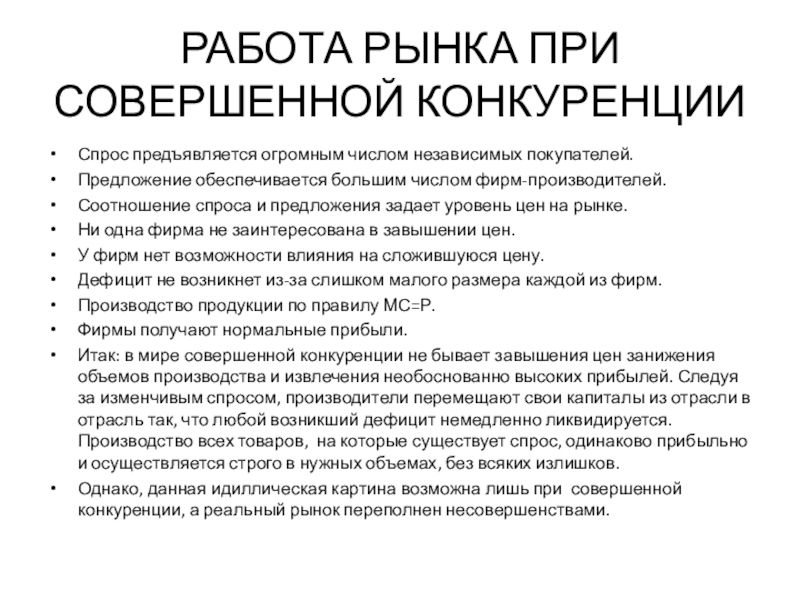 Слайд 10РАБОТА РЫНКА ПРИ СОВЕРШЕННОЙ КОНКУРЕНЦИИ