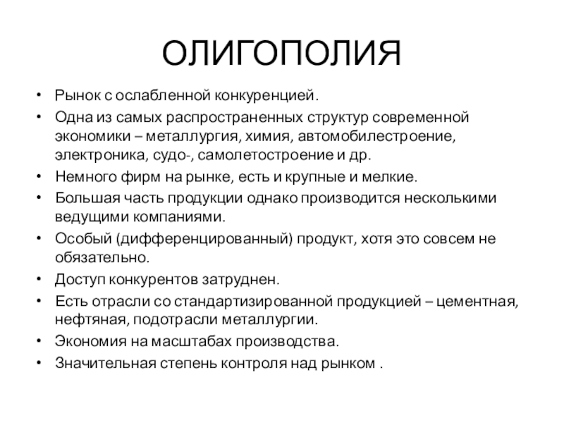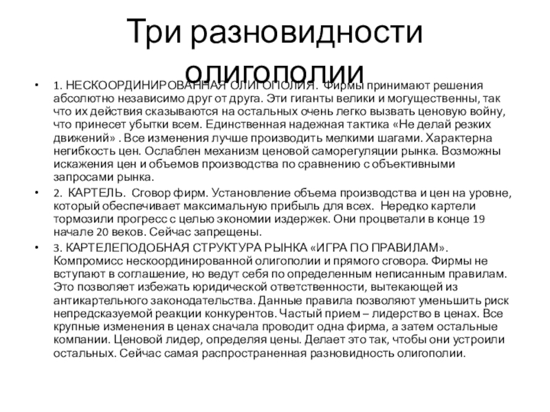 от друга. Эти гиганты велики и могущественны, так что их действия сказываются на остальных очень легко вызвать ценовую войну, что принесет убытки всем. Единственная надежная тактика «Не делай резких движений» . Все изменения лучше производить мелкими шагами. Характерна негибкость цен. Ослаблен механизм ценовой саморегуляции рынка. Возможны искажения цен и объемов производства по сравнению с объективными запросами рынка.