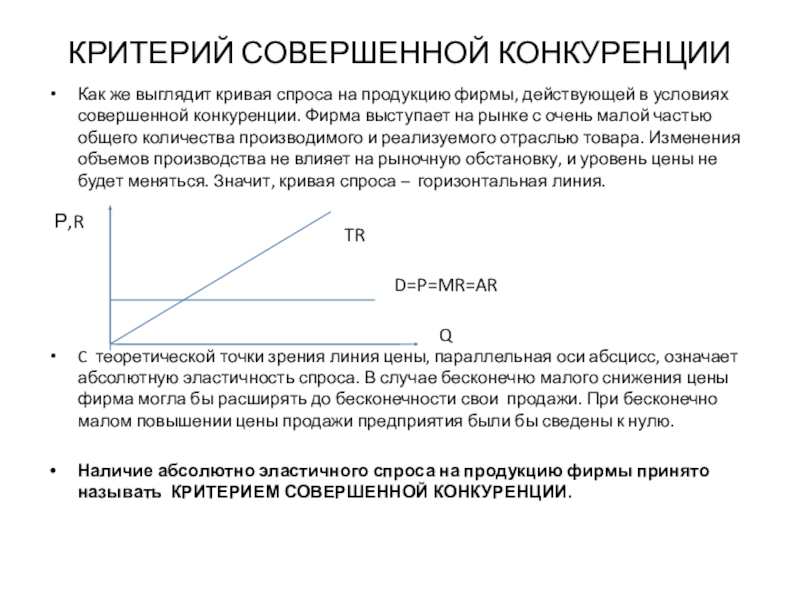 Наличие абсолютно эластичного спроса на продукцию фирмы принято называть КРИТЕРИЕМ СОВЕРШЕННОЙ КОНКУРЕНЦИИ.