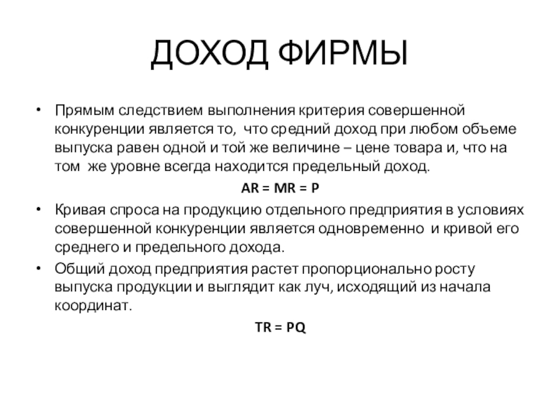 доход при любом объеме выпуска равен одной и той же величине – цене товара и, что на том же уровне всегда находится предельный доход.
