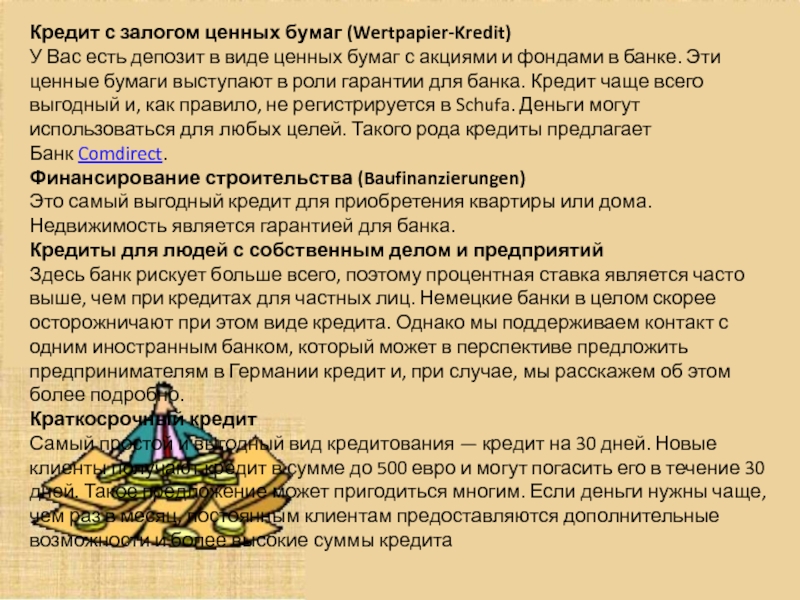 ценных бумаг с акциями и фондами в банке. Эти ценные бумаги выступают в роли гарантии для банка. Кредит чаще всего выгодный и, как правило, не регистрируется в Schufa. Деньги могут использоваться для любых целей. Такого рода кредиты предлагает Банк Comdirect.